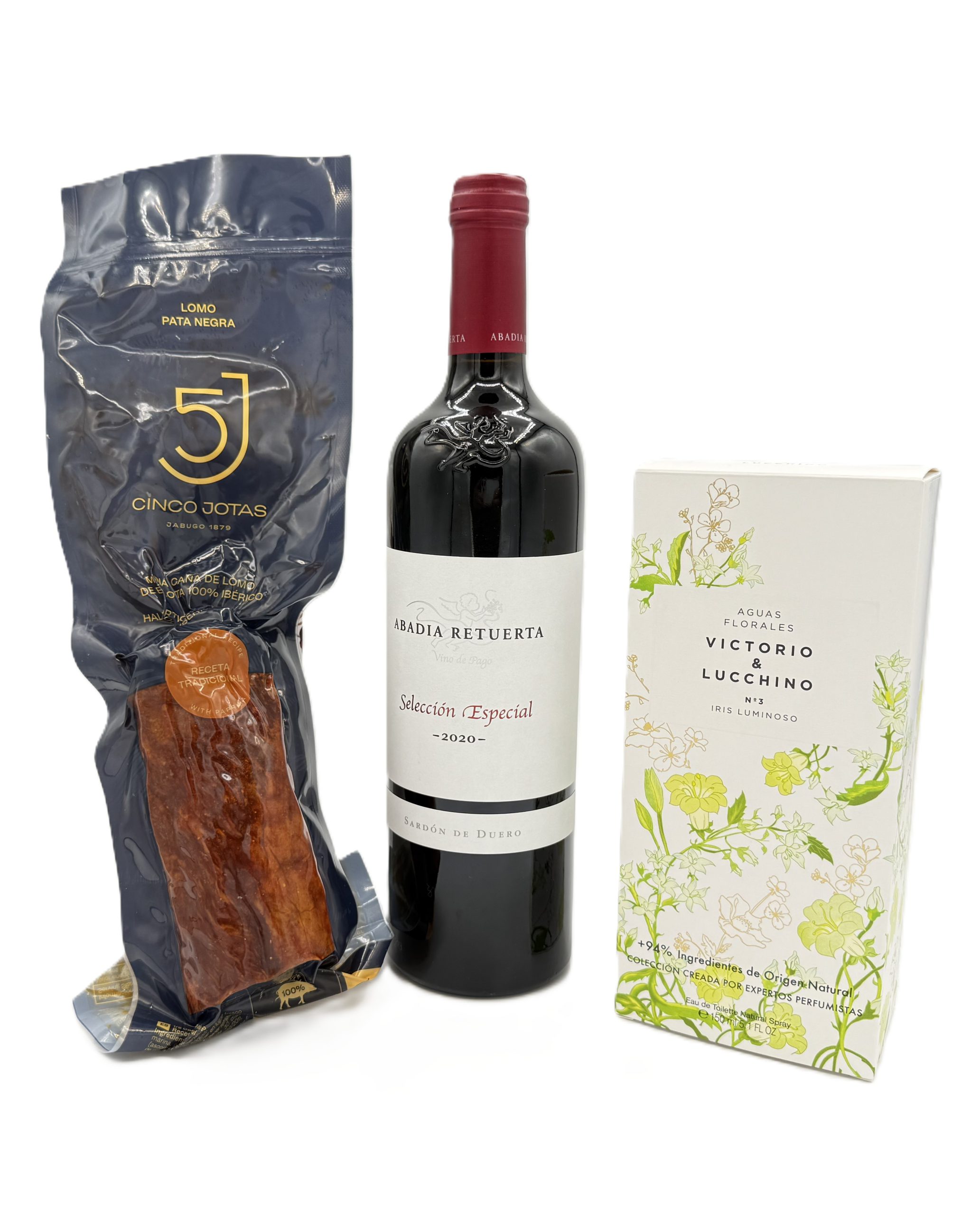 Regala vino Abadía Retuerta, lomo 5 Jotas y Aguas Florales Iris. Una caja elegante, gourmet y perfumada. Para sorprender con distinción.