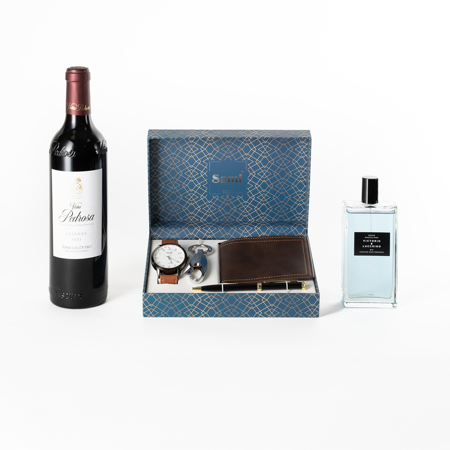 Caja regalo hombre con vino Ribera, perfume y accesorios